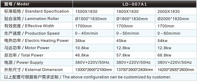 潛水料復合機/貼合機-單輪SBR復合機/貼合機LD-007A1的主要技術參數(shù) / Major technical parameters