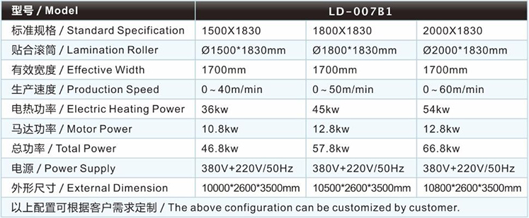 | 潛水料復合機/貼合機-單輪SBR復合機/貼合機LD-007B1的主要技術參數(shù) / Major technical parameters |